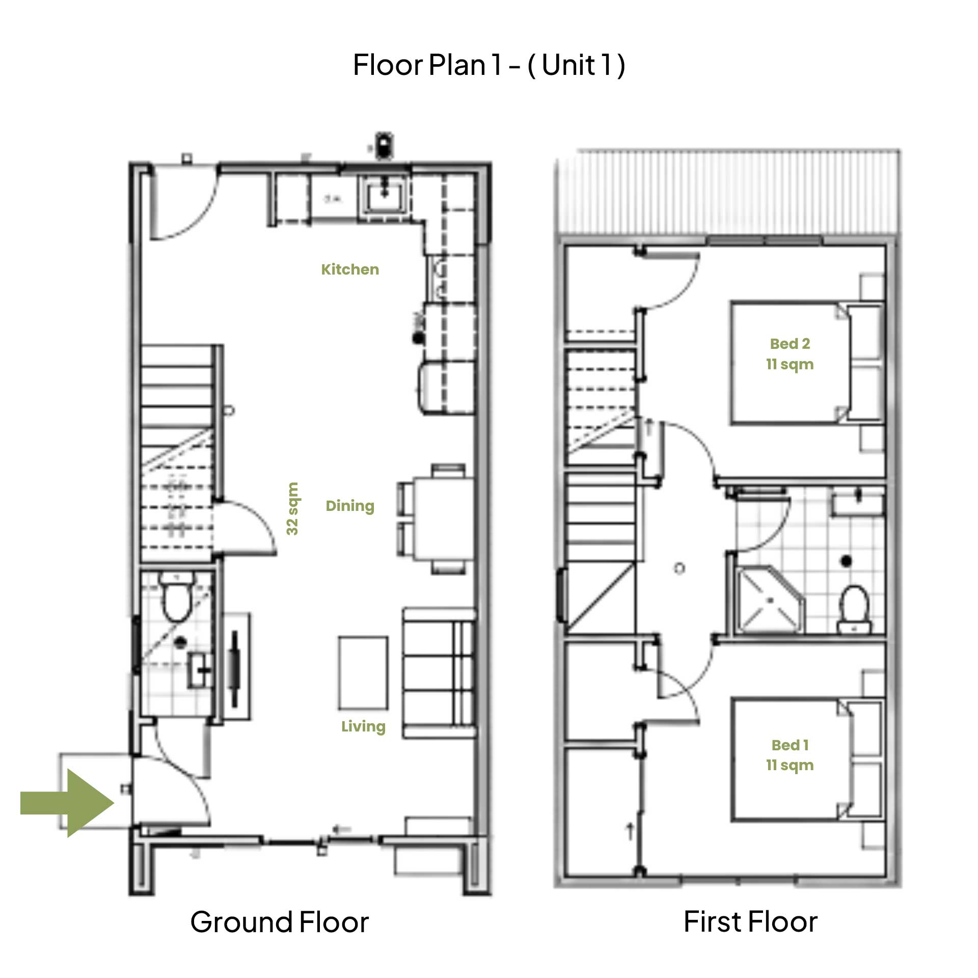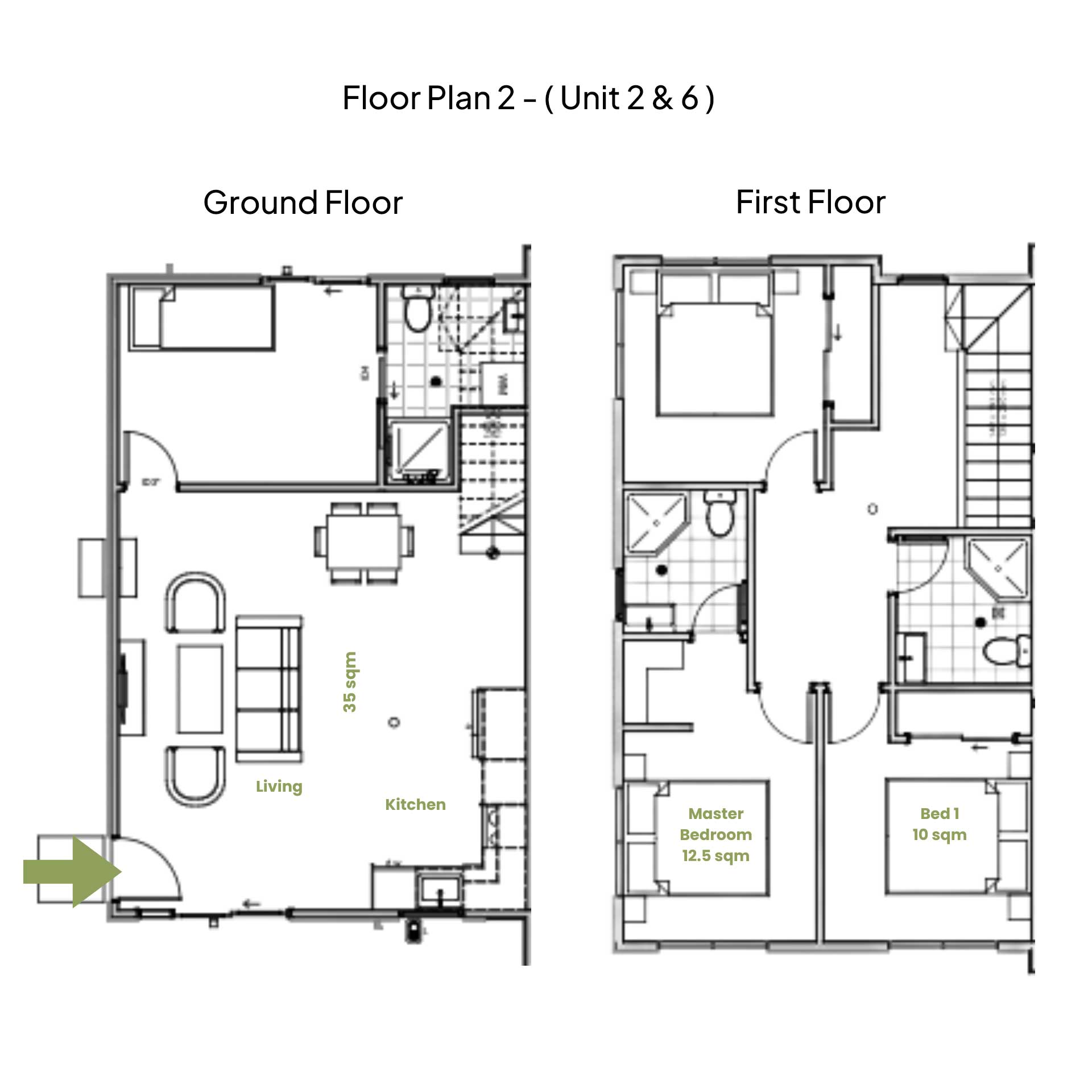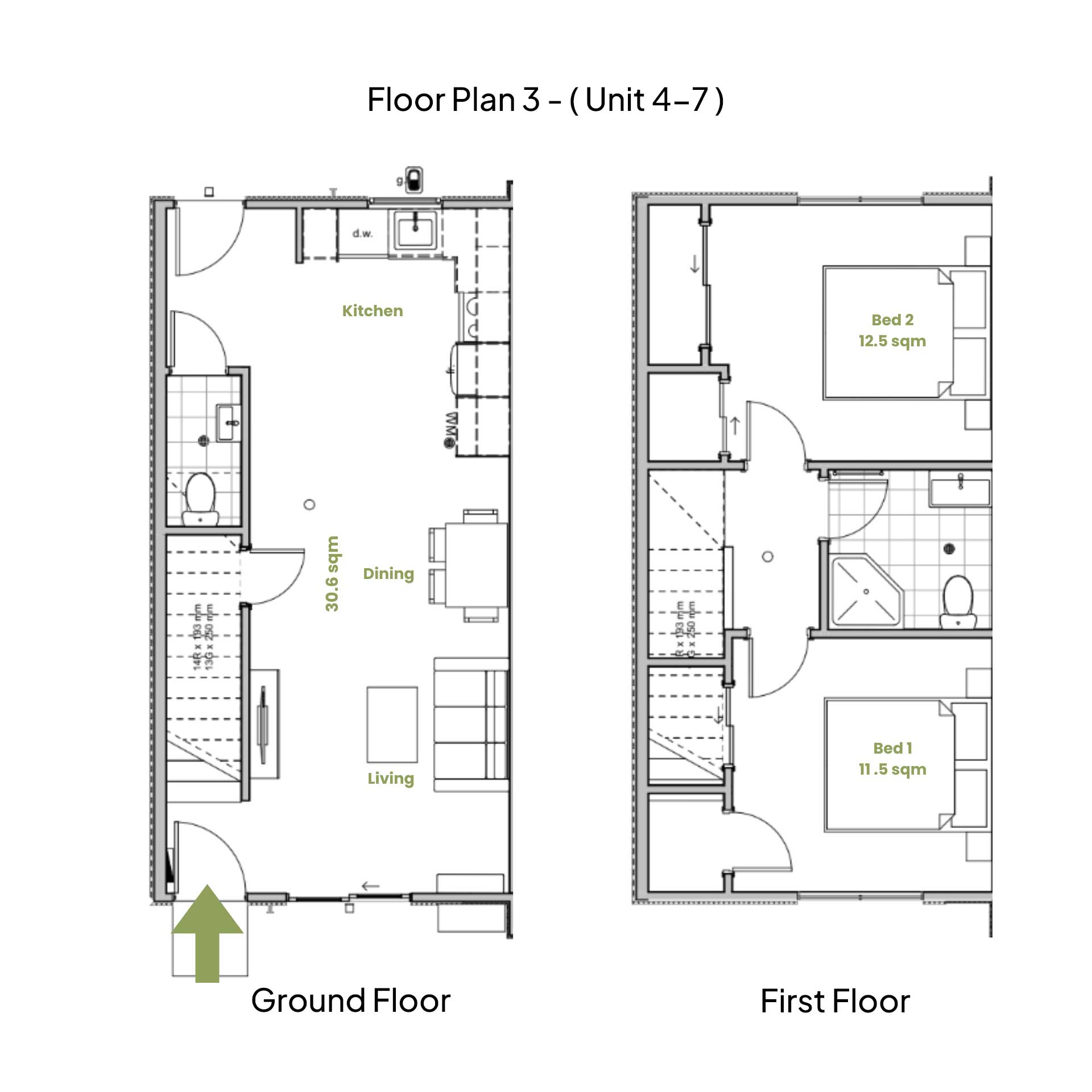 Five 2-bedroom homes are perfect for small families or professionals, featuring 1.5 bathrooms and low-maintenance living, ideal for those who value simplicity without compromising on quality.